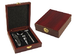 Caja barnizada con 4 accesorios metálicos de vino con finas terminaciones de madera.