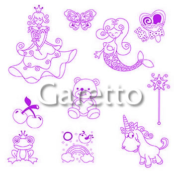 Practico set de timbres para ninos contiene timbres de goma de 4 x 4 cms aprox y tampon morado. Contiene 10 figuras con motivos de cuentos de hadas, como unicornio, princesa, sirena, sapito, mariposa, dulces,varita magica, osito, cerezas y pollito.