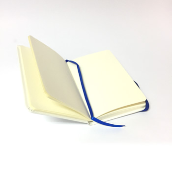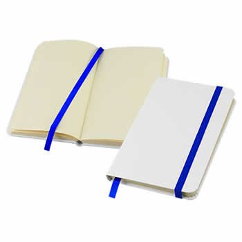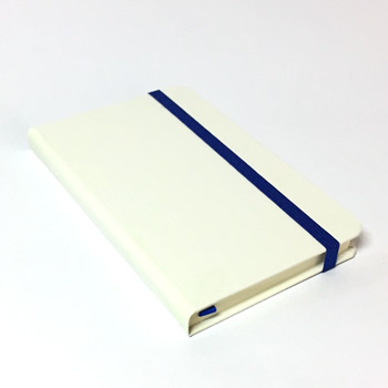 Libreta tipo "Whiteskine" tamaño A6, con cubierta de cartón piedra forrada en PU (cuero sintético) blanco de 1.5mm de espesor. Interior 80 hojas limpias amarillas de 80gsm. Incluye banda elástica y huincha separador de hojas de color. Presentación individual en bolsa de polipropileno.